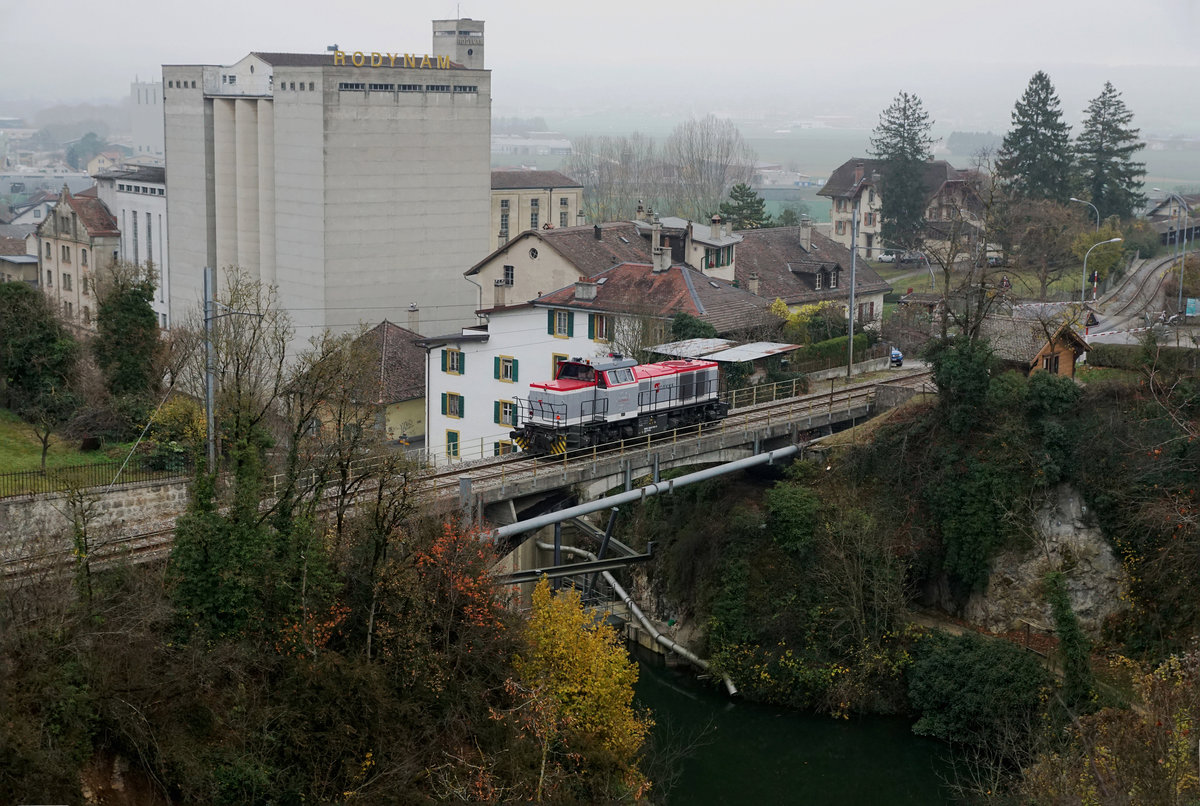 Hinweis zum Fotostandort: Das Verbindungsgleis TRAVYS/SBB sowie das Abstellgeleis SBB waren zum kurzen Zeitpunkt der Aufnahme geschlossen. Dies ist interessanterweise auf der Aufnahme erkennbar. Der Personenzug sowie die Am 842 von TRAVYS warteten auf die Abfahrt nach Orbe. Die SBB Am 843 war ausser Betrieb und abgestellt. Die sehr interessante und seltene Aufnahme der beiden Loktypen wurden mir erlaubt, da keine Rangierfahrten stattfanden zu dieser Zeit. Auch stand ich nicht im Gefahrenbereich der Streckengeleise.