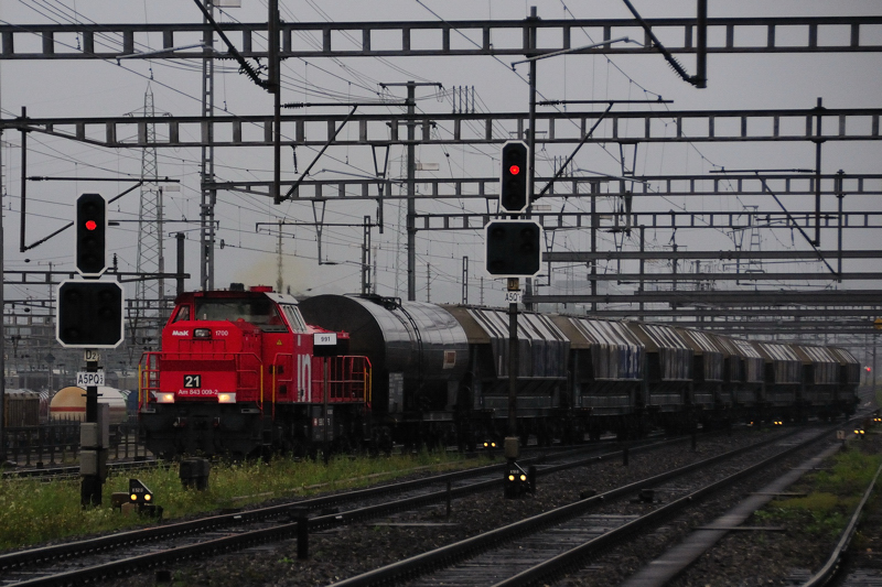 Am 843 009-2  infra  mit einem kurzen Übergabe-Güterzug auf dem Weg  quer  in den Rbf von Muttenz. (10.08.09).