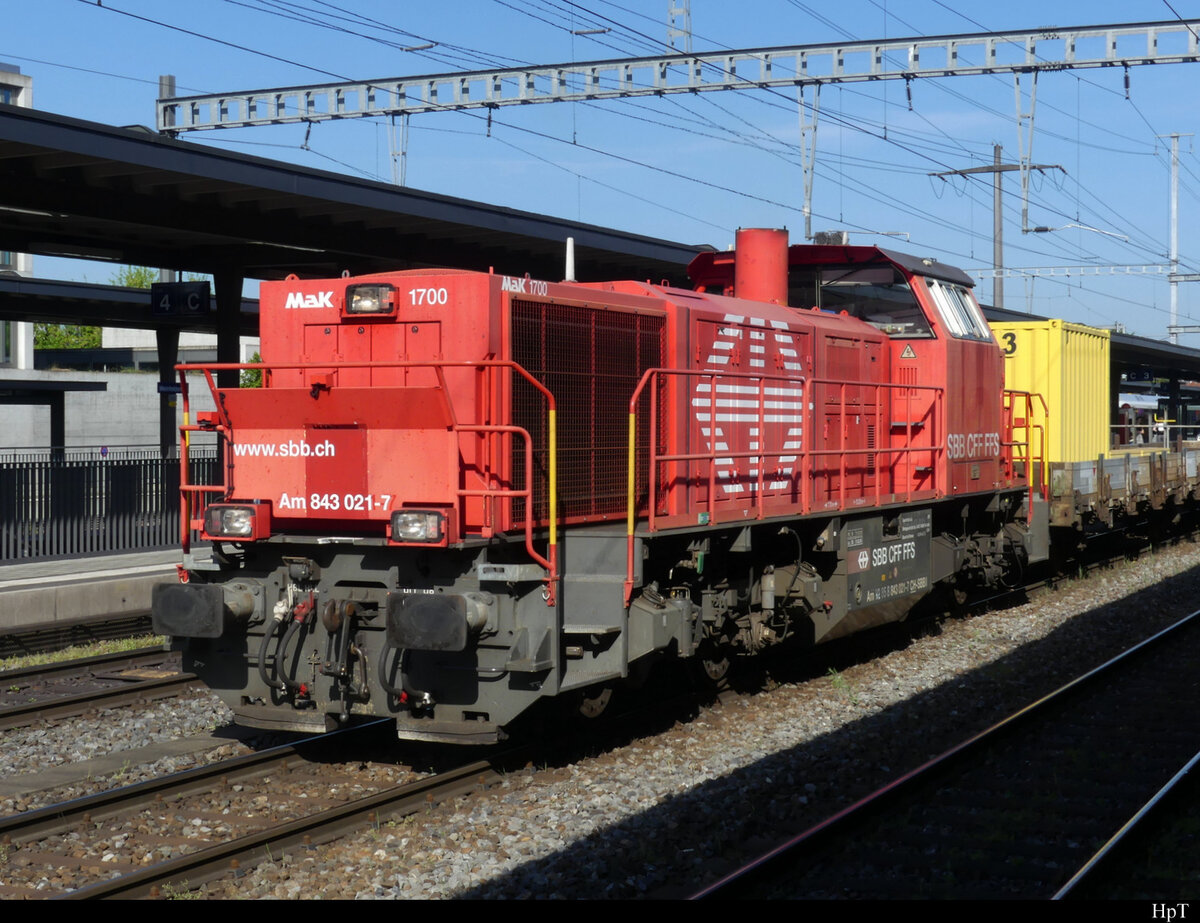 SBB - Am 843 021-7 mit 2 Güterwagen im Bahnhof von Weinfelden am 12.05.2022