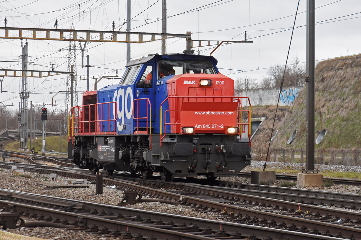 Am 843 071-2 durchfährt den Bahnhof Pratteln. Die Aufnahme stammt vom 28.01.2019.