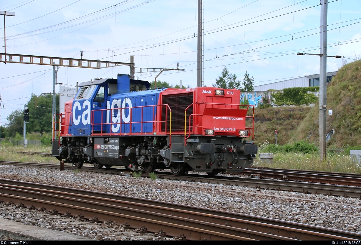 Am 843 071-2 der SBB Cargo als Lokzug durchfährt den Bahnhof Pratteln (CH) in östlicher Richtung. Aufgenommen von der Güterstrasse. [10.7.2018 | 12:08 Uhr]