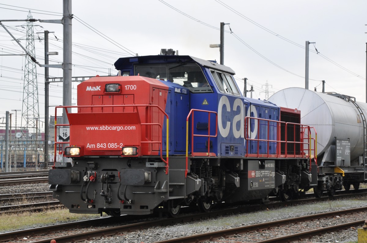 Am 843 085-2 beim Bahnhof Muttenz. Die Aufnahme stammt vom 29.01.2014.