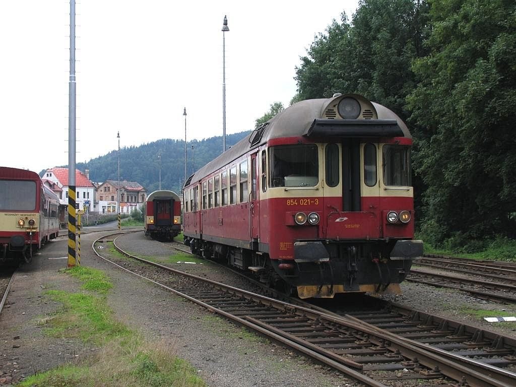 Baureihe 854 in alte und neue Lackierung: Hier steht die 854 021-3 (die im äußerlichen Ursprungszustand belassenen M296.1021) mit R 1143 Tanvald-Praha-Vrsovice abfahrtsbreit im Bahnhof Tanvald am 12-7-2009.