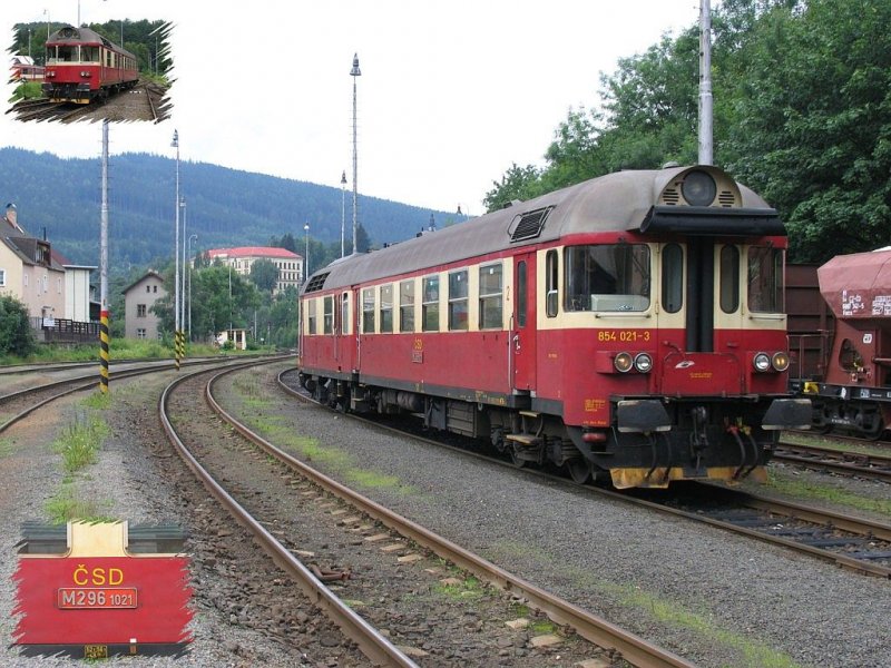 3 Bilder in 1: Auf dieses Bild sind die verschiedene Zugspitzen von die Triebwagens der BR 854 zu sehen (links oben) wie auch das CSD-Nummer (links unter). Die 854 021-3 in alte Lackierung und mit original Nummer M296.1021 während das Umlaufen auf Bahnhof Tanvald am 12-7-2009.