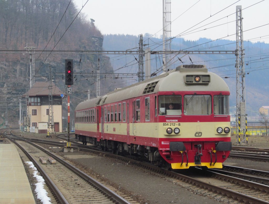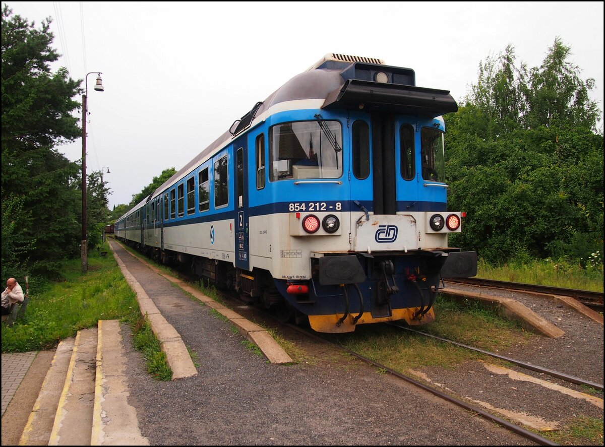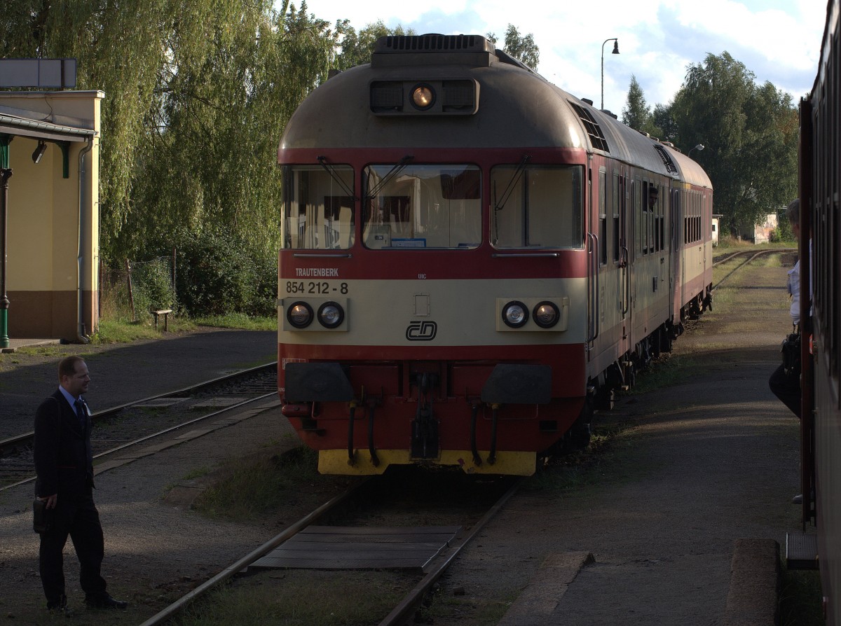 TW 854 212-8 "Trautenberg" begegnet einen andern TW der Baureihe 854.Zeit für einen kurzen Schwatz der Schaffner.16.08.2014 18:07 Uhr in Novy Bor. Siegfried Heße