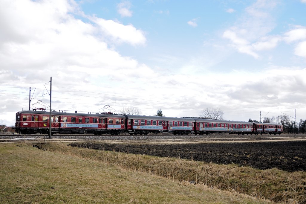 Nostalgie pur: ET 65 (465 006-5) der SVG mit Umbau-Vierachser, farblich und werbemäßig angeglichenem D-Zugwagen und Steuerwagen 865 606-8 als Sonderzug auf der KBS 980 bei Mindelaltheim am 26.02.2010 mit gut minus 10 Minuten. Helmut Dimitroff