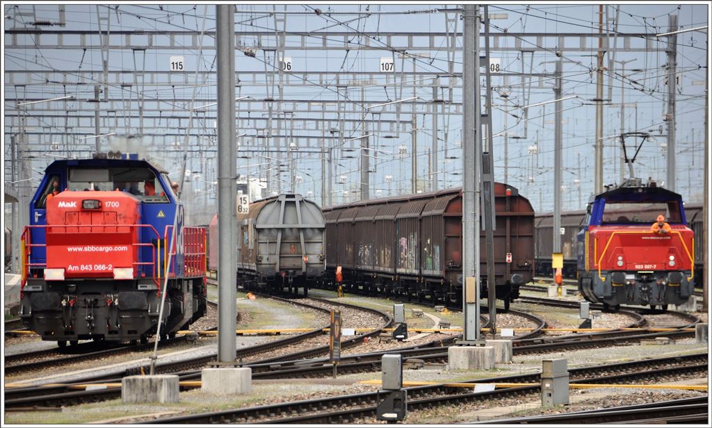 923 027-7 rangiert im fahrdrahtlosen Bereich des Bahnhofs Buchs SG. (05.04.2016)