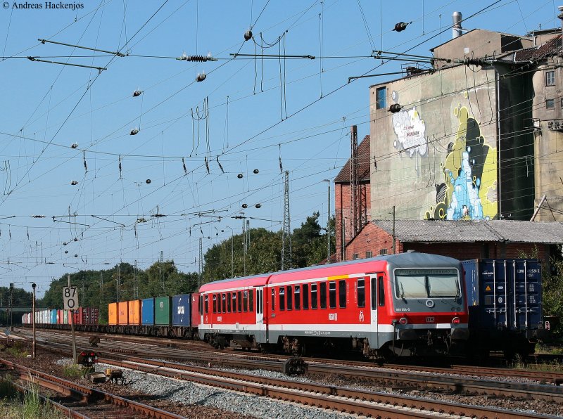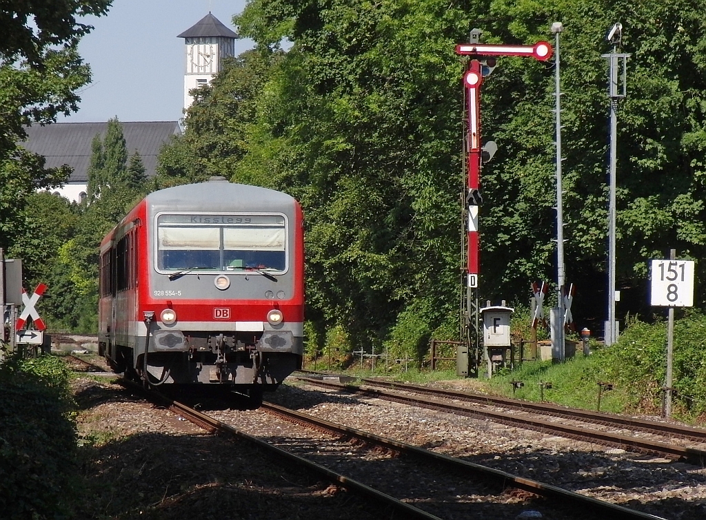 928 554-5 ist in Friedrichshafen als RB 22725 gestartet und wird in Kürze Lindau erreichen. Entsprechend der schon umgestellten Zugzielanzeige wird dieser Triebwagen als RB 22865 über Kißlegg nach Aulendorf weiterfahren (Lindau-Aeschach, 17.08.2013). Jürgen Vos