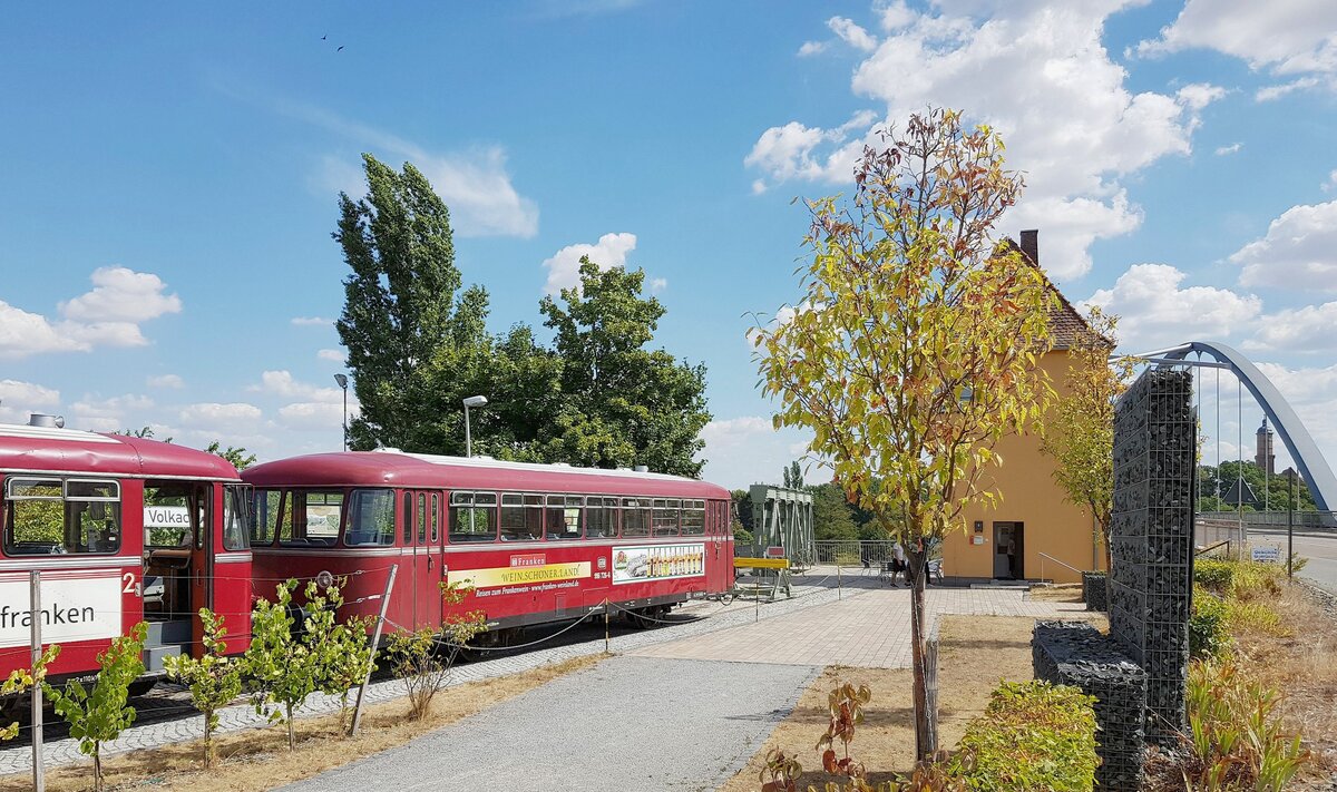 Mainschleifenbahn__Am 30. September 1991 wurde die Brücke über den Main, zwischen Astheim und Volkach Bhf.für den Schienenverkehr "aus technischen Gründen" gesperrt, nachdem am selben Tag zum letzten Mal ein Ölzug vom Tanklager Volkach das Bauwerk überquert hatte. Seit dem endet die Strecke am westlichen Mainufer in Volkach-Astheim. Es war eine gemeinsame Straßen- und Eisenbahnbrücke, 1959 wurde hierfür das dreigeschossige Schrankenwärterhaus (mit privatem Wohnbereich) errichtet, das ab 1971 durch eine neue automatische Schrankenanlage, bedient durch das Zugpersonal, seine Funktion verlor. Im Bild Steuerwagen VS 996 726-6 von MAN Nürnberg 1960.__13-08-2022 Klaus-Erich Lisk
