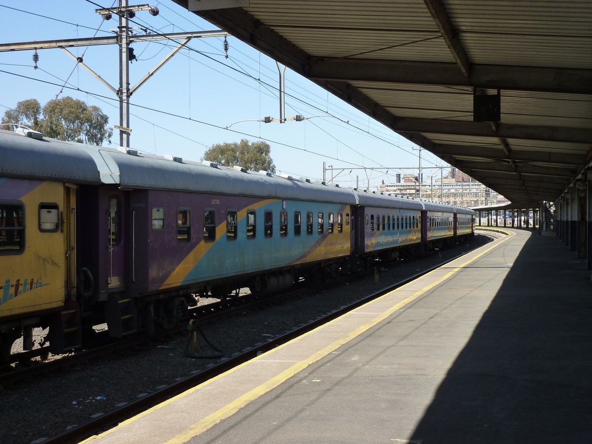 Ein abgestellter Shosholoza Meyl Zug am 05.09.2014 in Bloemfontein. Einst ein wichtiger Bahnknoten wird Bloemfontein nur noch von 6 Zugpaaren die Woche bedient. Seit der Einstellung des Trans-Oranje Express besteht nicht einmal mehr eine Verbindung in das benachbarte Komberley. Die Lok des Zuges konnte ich leider nicht fotografieren da man eine Genehmigung braucht und die Lok im Sichtfeld eines Bahnbeamten stand. Matthias Handschuch