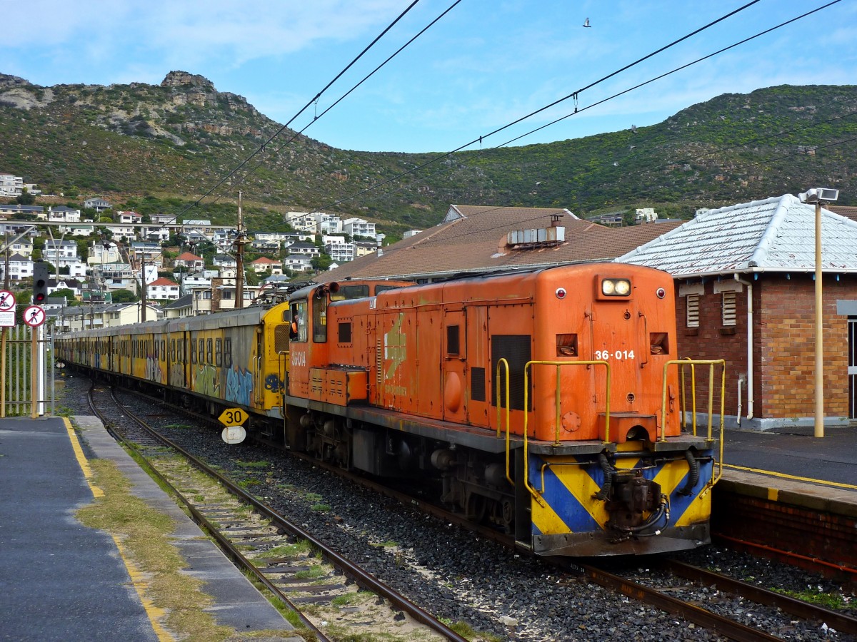 36-014 schleppt am 26.07.2014 einen vermutlich defekten Metrorail Triebzug von Simonstown durch Fish Hoek in Richtung Kapstadt