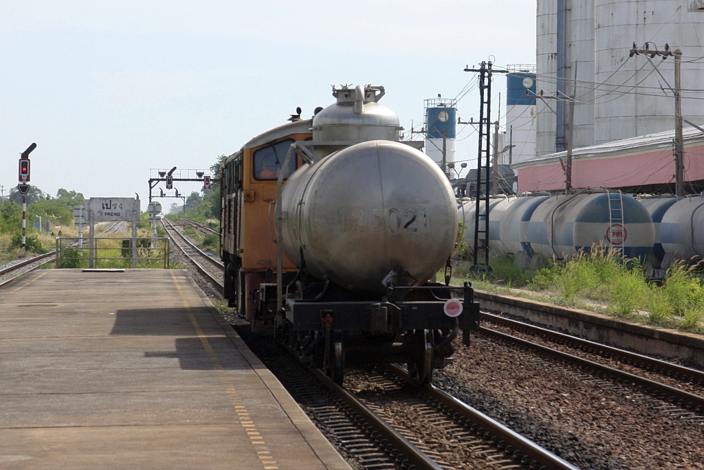 Brandschutzzug für den Steamtrain 903 (Hua Lamphong - Chachoengsao) mit dem บ.ท.ค.126021 (บ.ท.ค. =B.O.T./Bogie Oil Tank Wagon) als einzigem Wagen fährt am 05.Dezember 2024 durch die Preng Station.