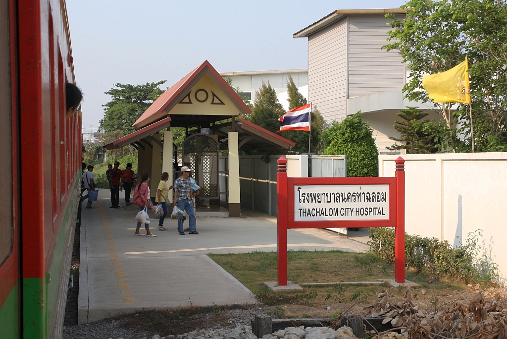 In unseren Breiten ist es bei den Staatsbahnen üblich, dass Nebenbahnen eingestellt oder Stationen geschlossen werden. - Nicht so in Thailand. Auf der 33,57 Km langen, vom übrigem Bahnnetz isolierten, Mae Klong Line wo täglich bloß 4 Zugspaaren verkehren wurde nicht nur der Oberbau erneuert sondern auch zusätzlich neu die Tha Chalom City Hospital Station errichtet. - Bild vom 01.Mai 2024. Karl Seltenhammer