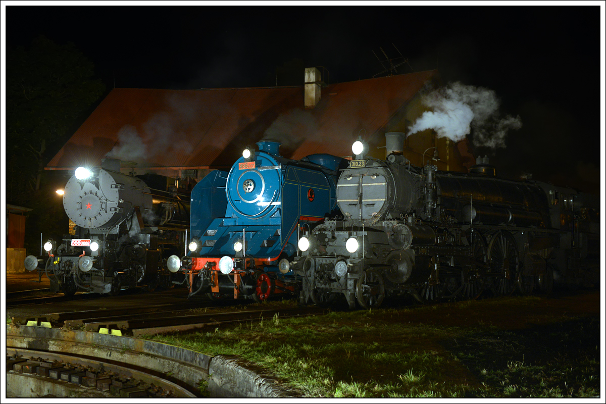 Nachtparade in Benešov u Prahy anlässlich des "Festival parních lokomotiv - Steam 50" am 21.9.2019. 555 3008 aus Bratislava neben 486.007 vom Depot Vrútky und 310.23 aus Strasshof. Hanspeter Reschinger