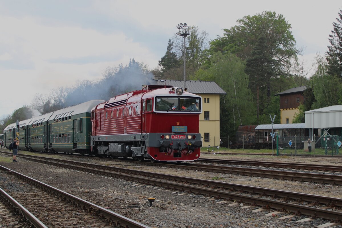 Am  11 Mai 2024 verlasst ein Sonderzug nach Ptraha hl.n. mit T478 3300 am der Spitze Luzna u Rakovnika. Das Bild ist vom -während die Dampftage- offenbar zugängiger Platz gemacht.
