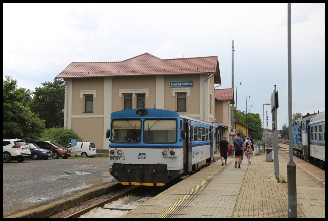 Zugkreuzung am 6.6.2024 um 15.45 Uhr im Bahnhof Neratovice. Rechts steht abfahrbereit der Schnellzug nach Prag mit der Taucherbrille 750708-0. Als Gegenzug ist der Altbau Triebwagen 854001-5 angekommen.