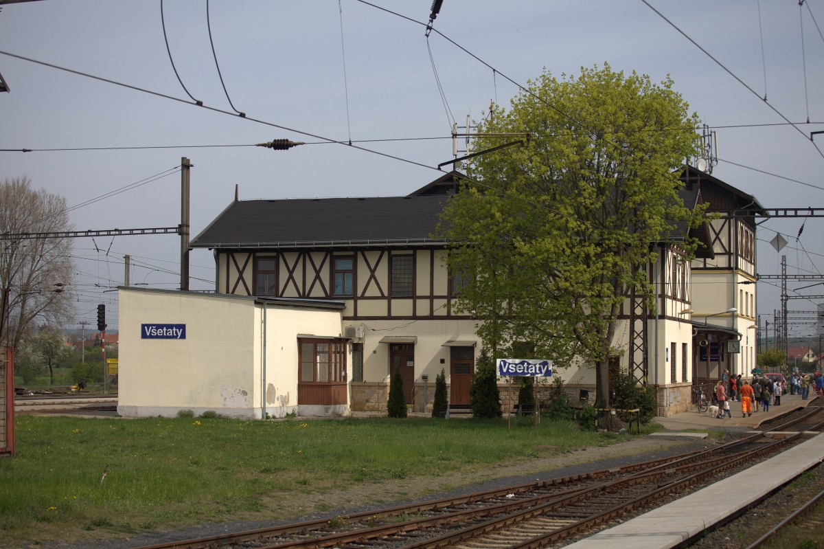 Blick auf das südwestliche Gleisvorfeld von Vsetaty. Der Schnellzug nach Lyssa nad Labem fährt gerade aus. 30.05.2014 10:04 Uhr.