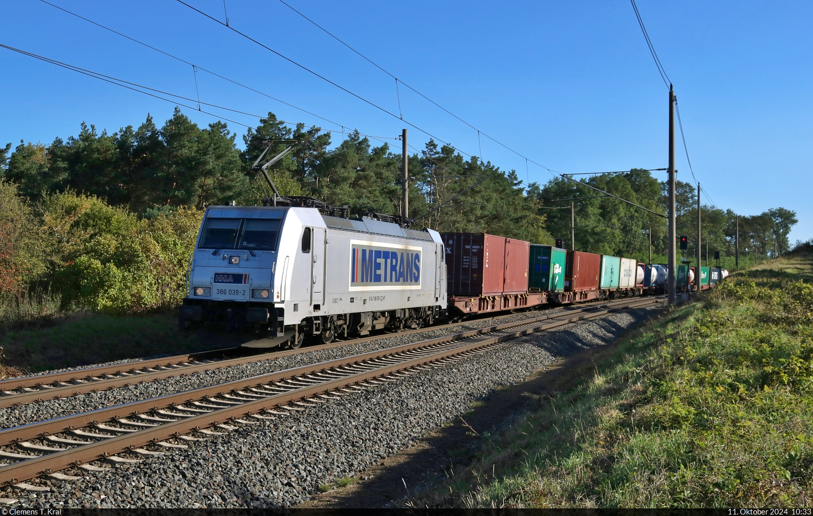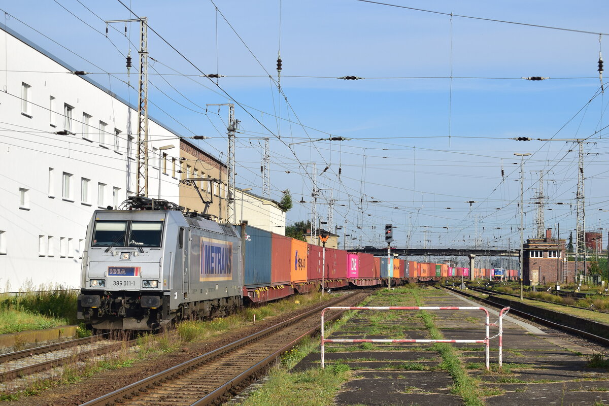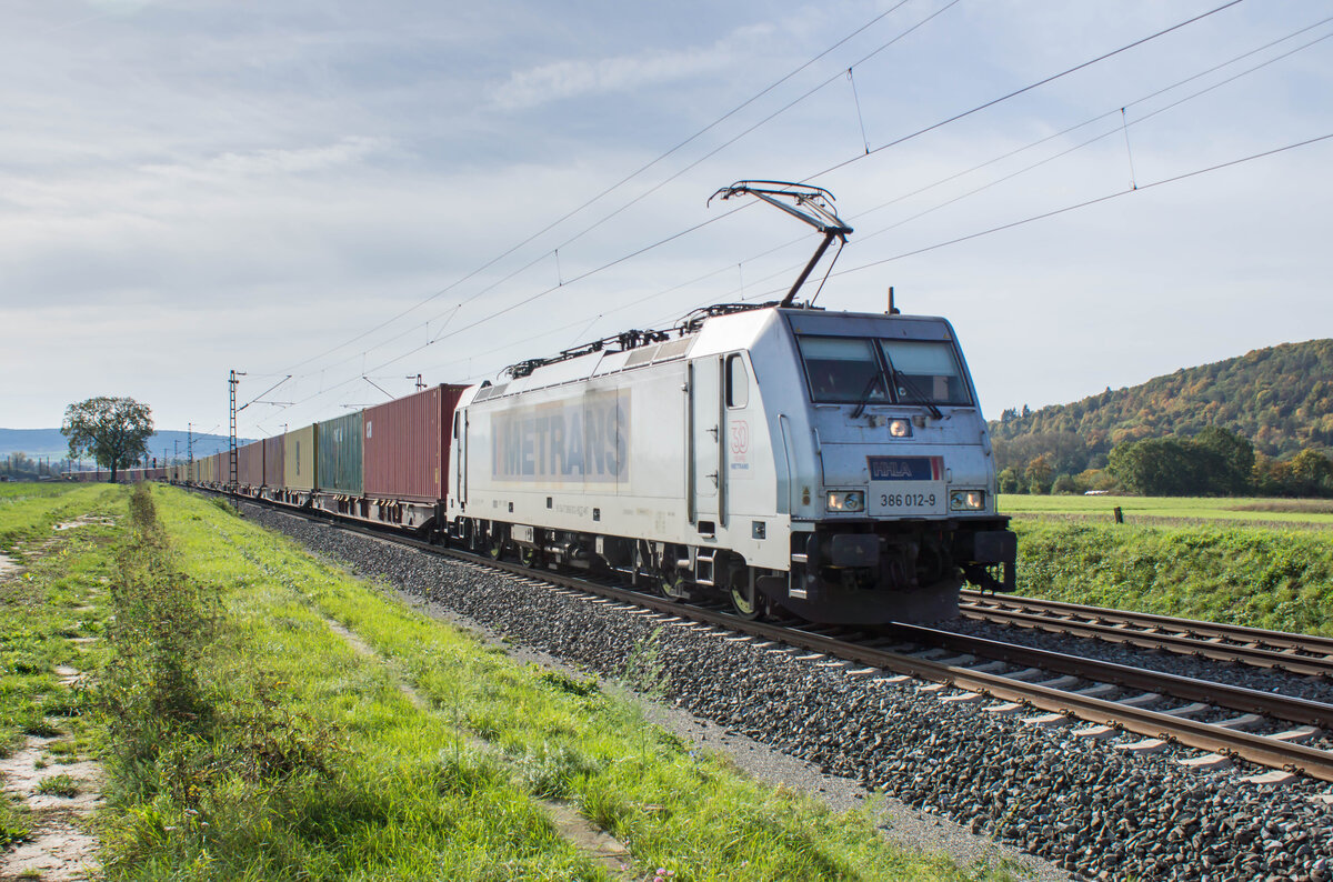Mit einem Containerzug am Haken rollte 386 010 von Metrans am 12.10.25 vorbei am herbstlich gefärbtem Farn in Wittenberg-Labetz Richtung Falkenberg(E). Martin Schneider