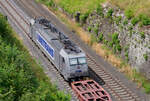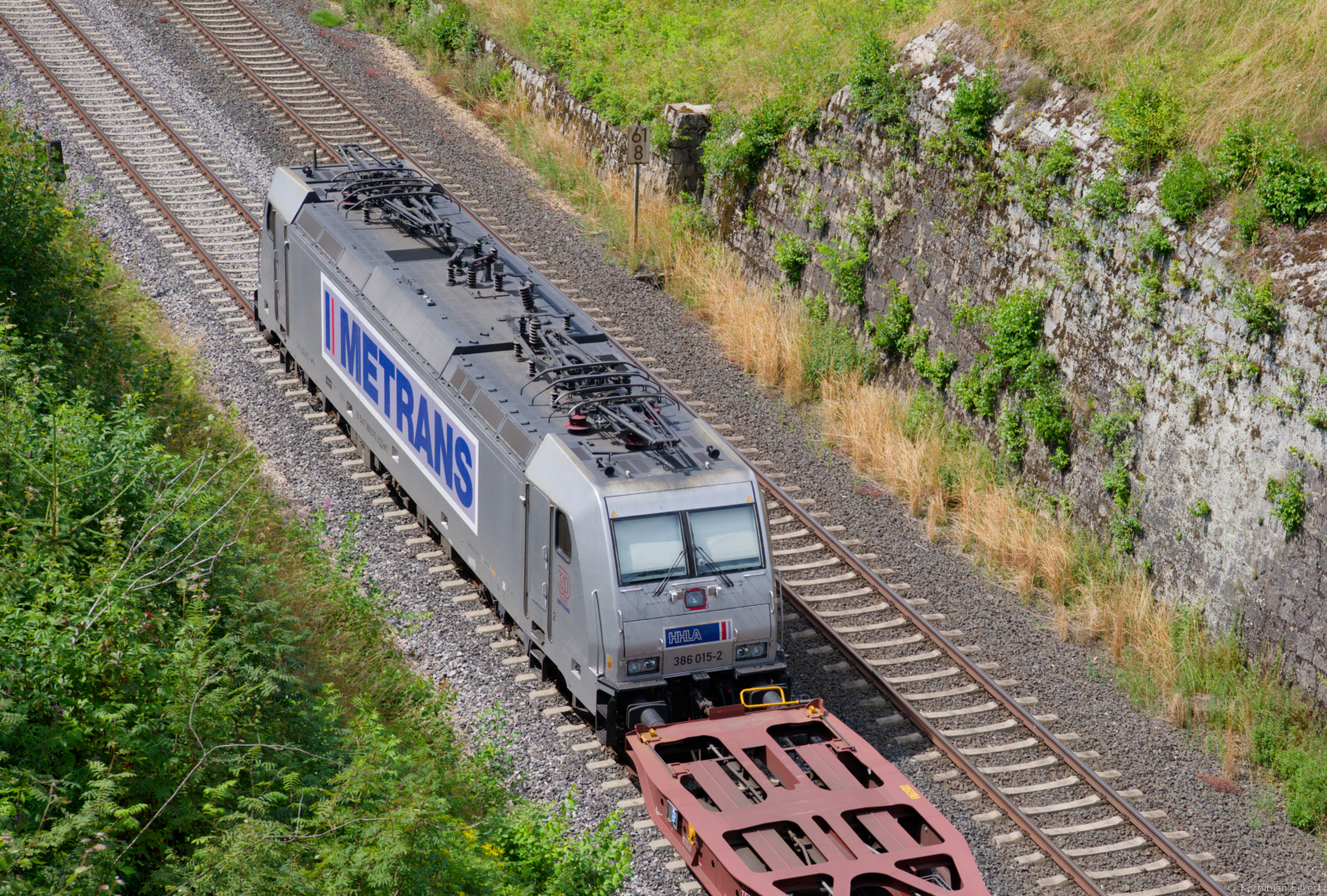 Metrans 386 031 mit einen KLV aus Tschechien nach Hamburg als Elbtalumleiter über das Vogtland hier bei Ruppertsgrün/Pöhl am 04.11.2025 aufgenommen. Andreas Schreiber