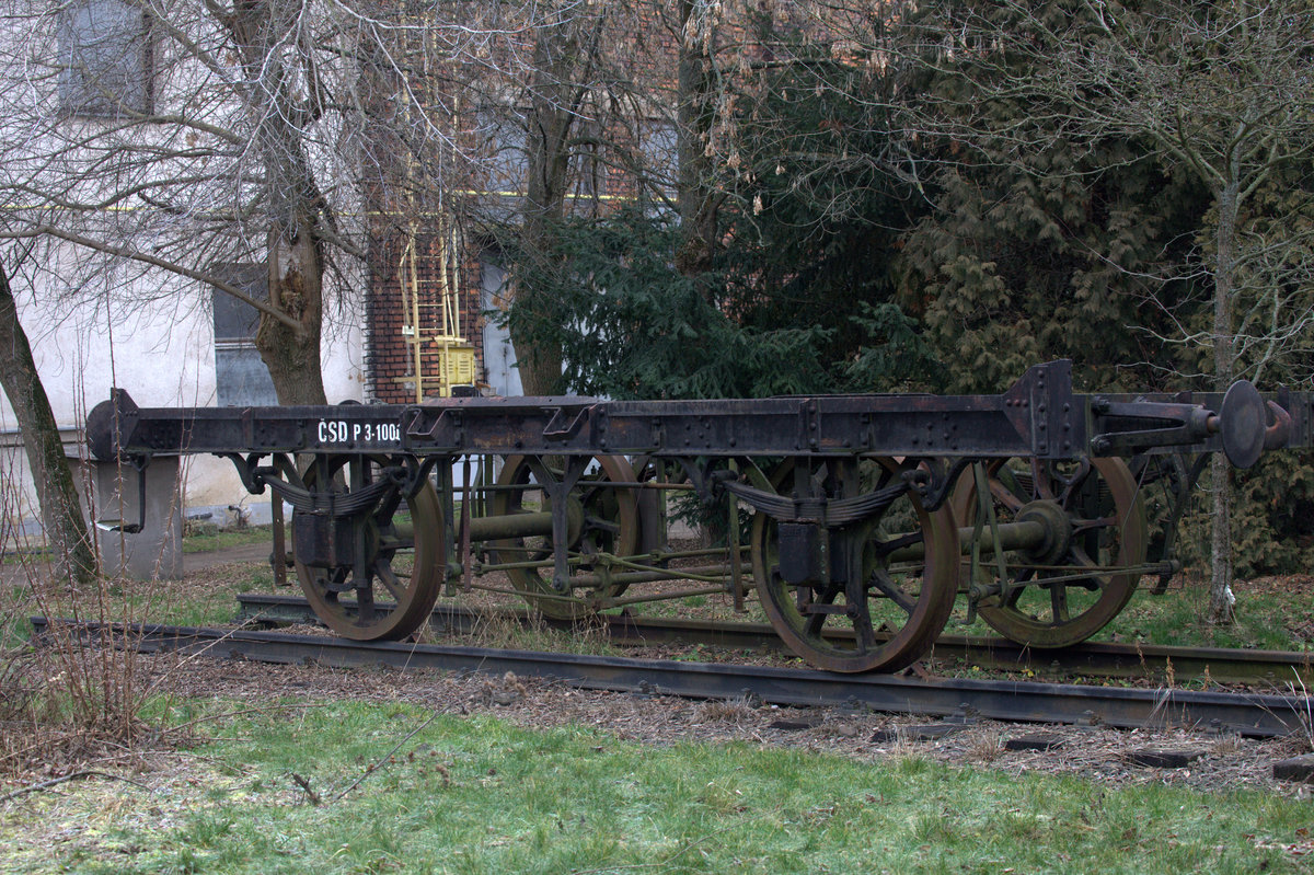 Ausgestellt in Turnov, das Untergestell eines Güterwagens, die Gattung ist nicht zu ermitteln. Der dort tätige Verein arbeitet alte CSD Güterwagen auf. 24.02.2020 11:49 Uhr.Wenn Vereinsmitglieder anwesend sind , dürfen die Aussenanlagen besichtigt werden, ein kleine Spende öffnete auch die Tür der Werkstatt, aber es wurde gebeten in der Halle nicht zu fotografieren. Siegfried Heße