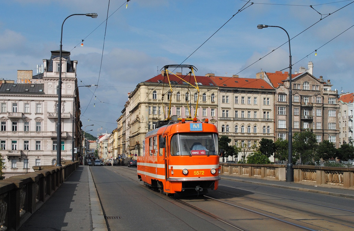 Tw.5572, der vor vielen Jahren aus einem T3 - Triebwagen zum Schienenschmierwagen umgebaut wurde beim Überqueren der Palackehobrücke. (26.08.2024) Erwin Schidlofski
