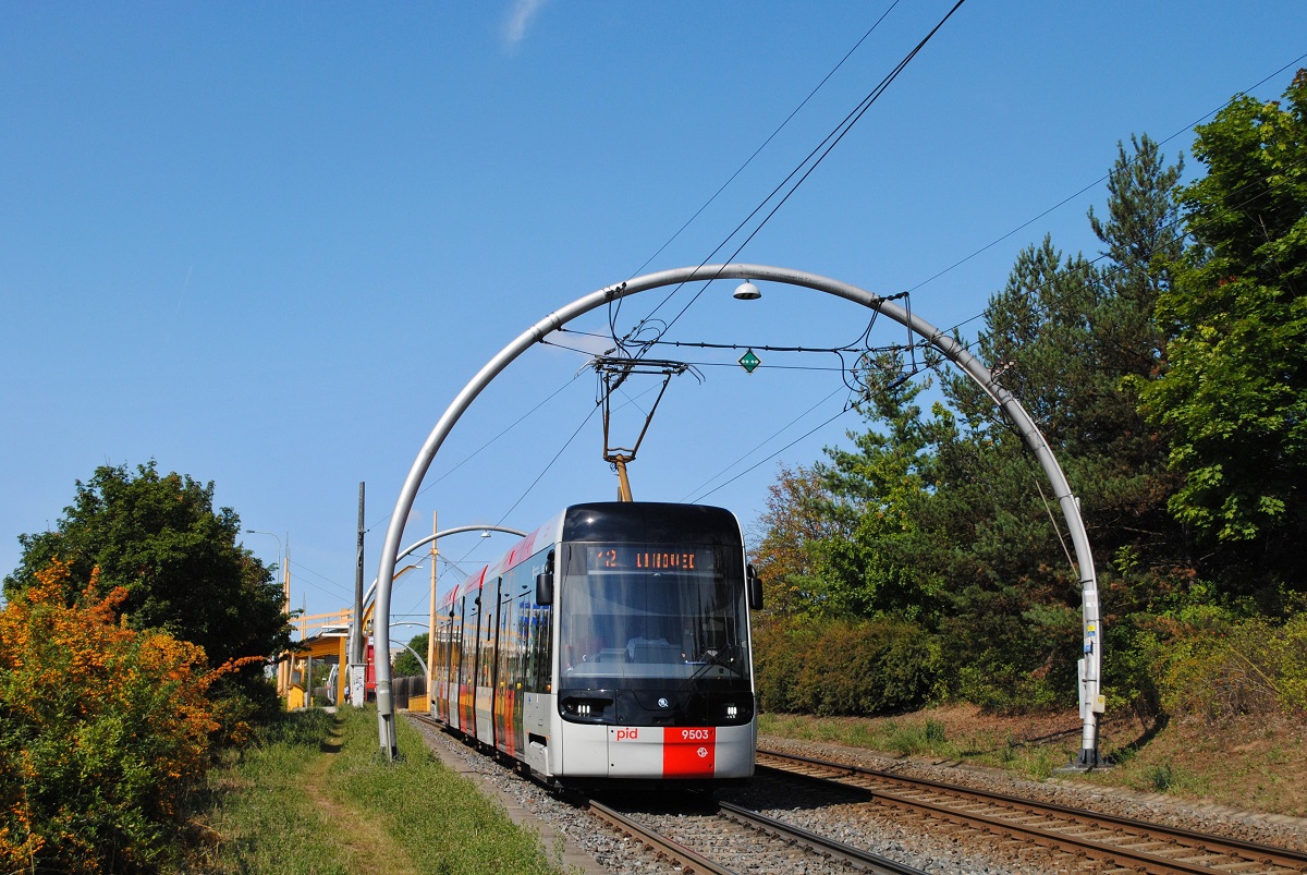 Als erstes von vierzig Fahrzeugen der neuen Reihe "ForCity Plus 52T" wurde der Tw.9503 ab 20.06.2025 im planmäßigen Personenverkehr eingesetzt. Hier zu sehen auf der Linie 12 kurz hinter der Haltestelle Geologicka auf der Fahrt ins Stadtzentrum. (01.09.2025) Erwin Schidlofski