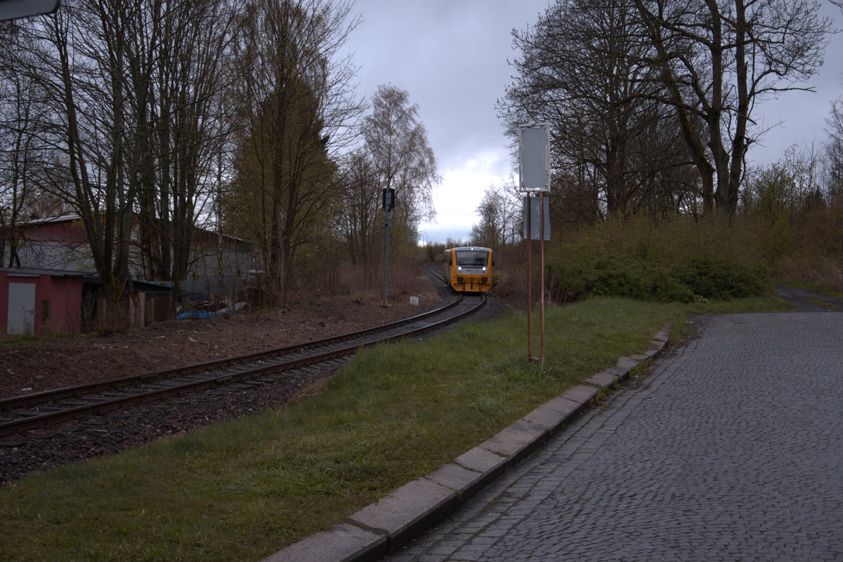 Bahnstrecke Asch - Hranice v Cechach. Hier kommt ein Zug vom Bahnhof Asch/Mesto und fährt in den Bahnhof Asch ein. Diese ca. 2 km lange Spange wird mehrmals täglich mit Pendelzügen bedient.