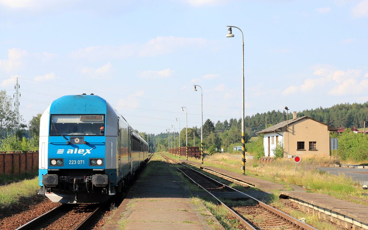Der Alex ALX 535 "Albert Einstein", bei der ČD als Ex 535 bezeichnet, fährt am 15.09.2015 in Domažlice aus, um von hier über Plzeň nach Prag zu gelangen. Die Lok 223 069 wird bis Plzeň-Jižní Předměstí am Zug verbleiben, dort wird dann in der Regel auf eine 363 umgespannt, die letzten Kilometer bis Prag haben ja 3 kV Gleichstrom. Auf der Rückfahrt wird übrigens schon in Plzeň hl.n. die Lok gewechselt. Die Verspätung betrug an diesem Tag 25 Minuten, bedingt durch eine Umleitung auf der deutschen Seite. Thomas Scherf