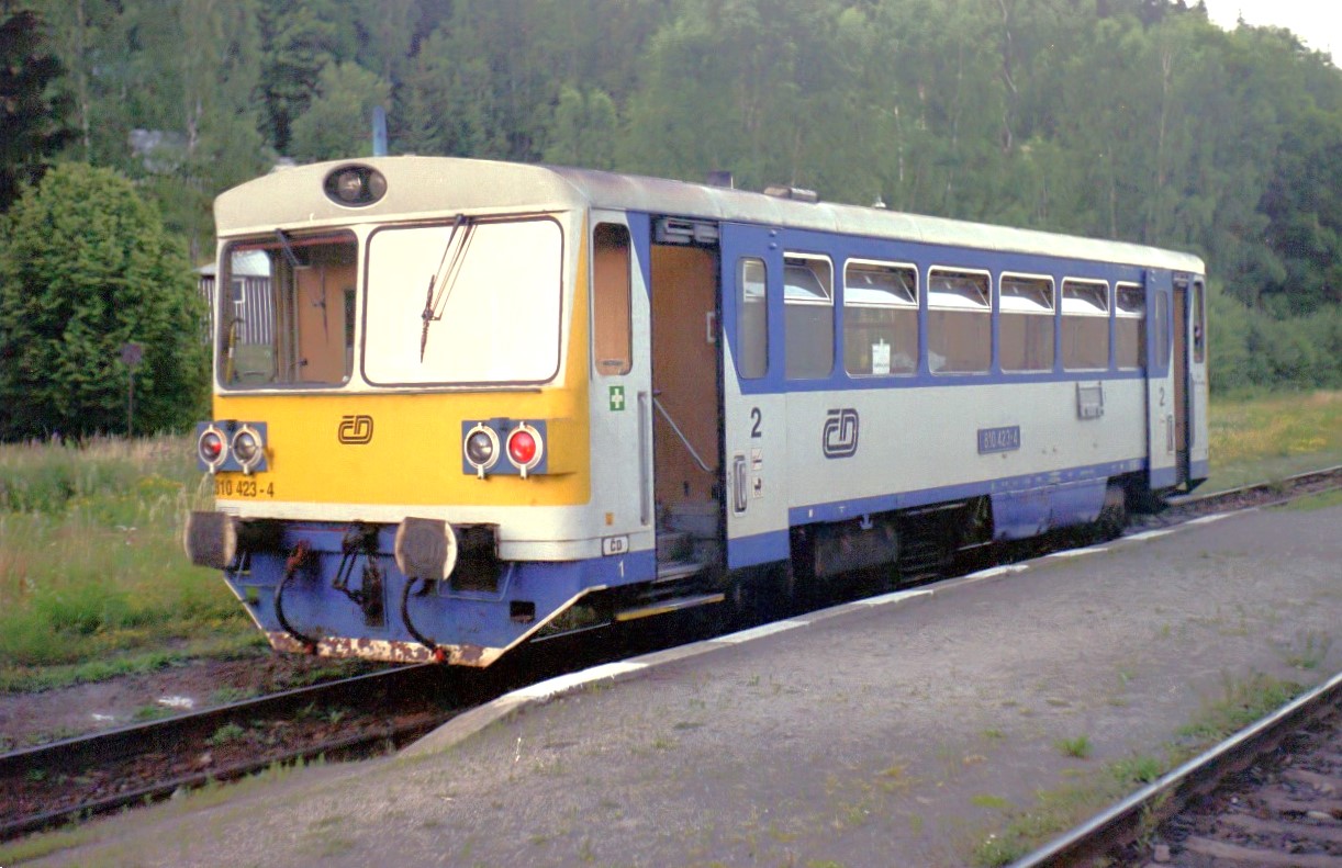 eine seltene Aufnahme von einer Brotbüchse in ODS-Lackierung; 810 423 im Juli 2006 im Bahnhof Kořenov