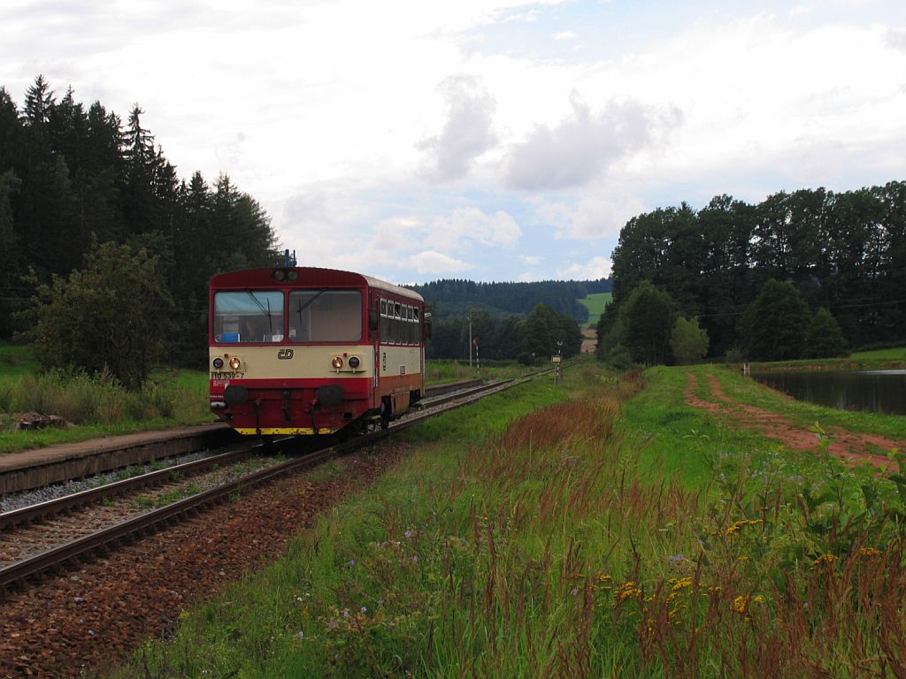 Der Bahnsteig von Nove Udoli liegt übrigens direkt am Grenzstreifen zu Bayern, die bis 1945 weiterführende Strecke über Haidmühle nach Passau wurde allerdings abgebaut. Der Ort Nove Udoli wurde in den 50er Jahren des letzten Jahrhunderts dem Erdboden gleichgemacht, heute gibts ein neu errichtetes Hotel und 3 Buden für den zollfreien Einkauf, der von den Bayern gern benutzt wird.