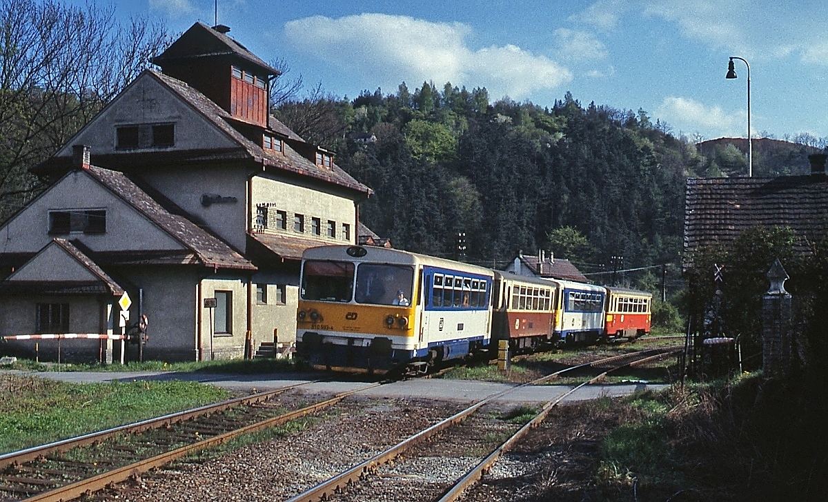 Dieseltriebwagen der CSD: Eine bunte 810-Garnitur mit dem 810 593-4 an der Spitze fährt im Frühjahr 1998 in den Bahnhof Zbecno (Strecke Beroun - Rakovnik) ein