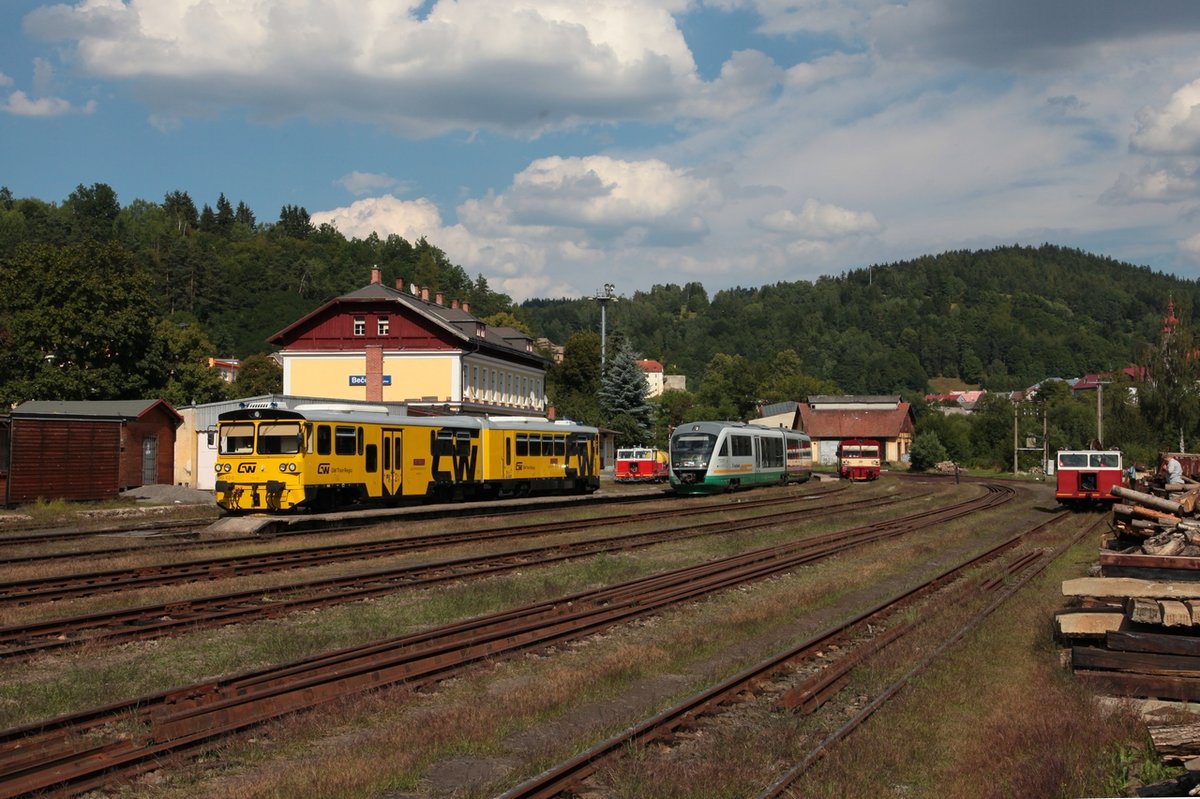Egronet-Erkundungstour 16.-18.08.2013  Nach dem Stadtrundgang zurück am Bf Bečov n.T. und max. Zugbetrieb, von links nach rechts: 913/813 102 (GW Train Regio) als MOs7109 nach Mariánské Lázně bei Ausf.; MUV 69-583; VT08 (der VBG) als ZOs36084 nach Karlovy Vary d.n.; 810 459 als MOs16745 nach Žlutice und ein weiterer MUV. 17.08.2013