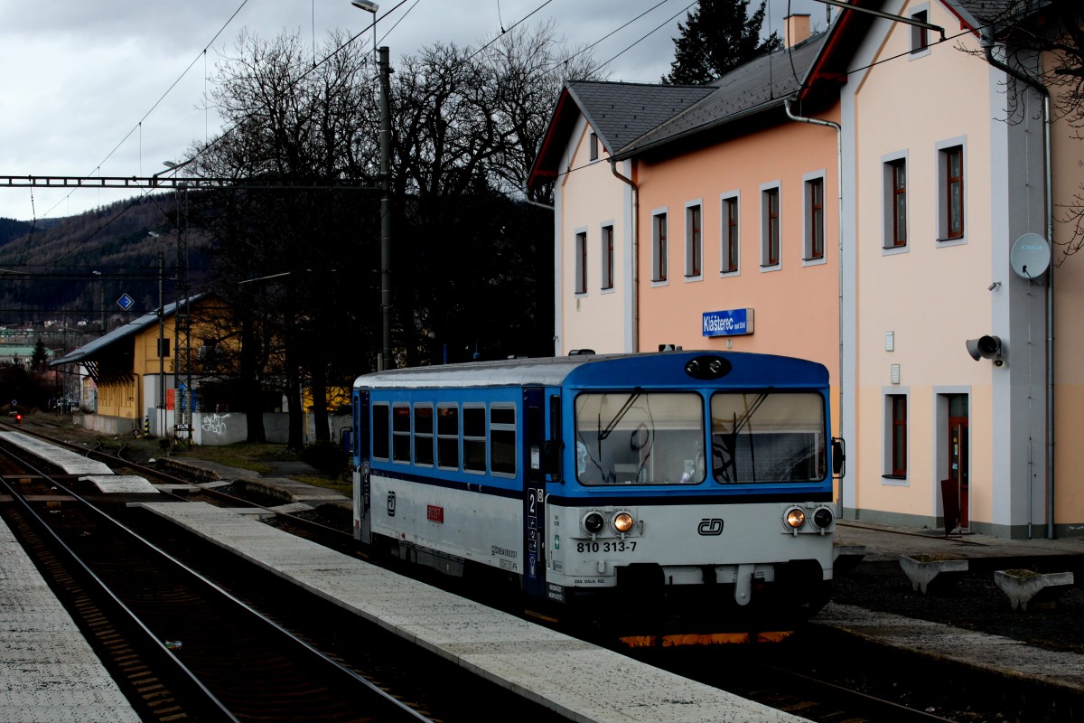 In Klasterc nad Ohri wird ein TW der Reihe 813 vom Schnellzug Cheb-Praha überholt. 08.02.2016 09:51 Uhr