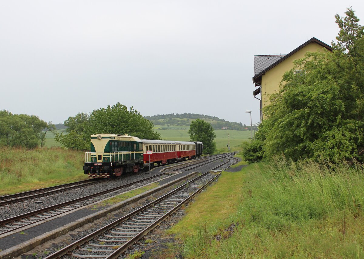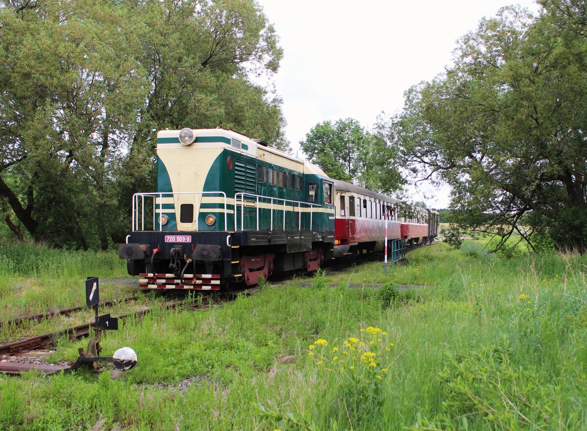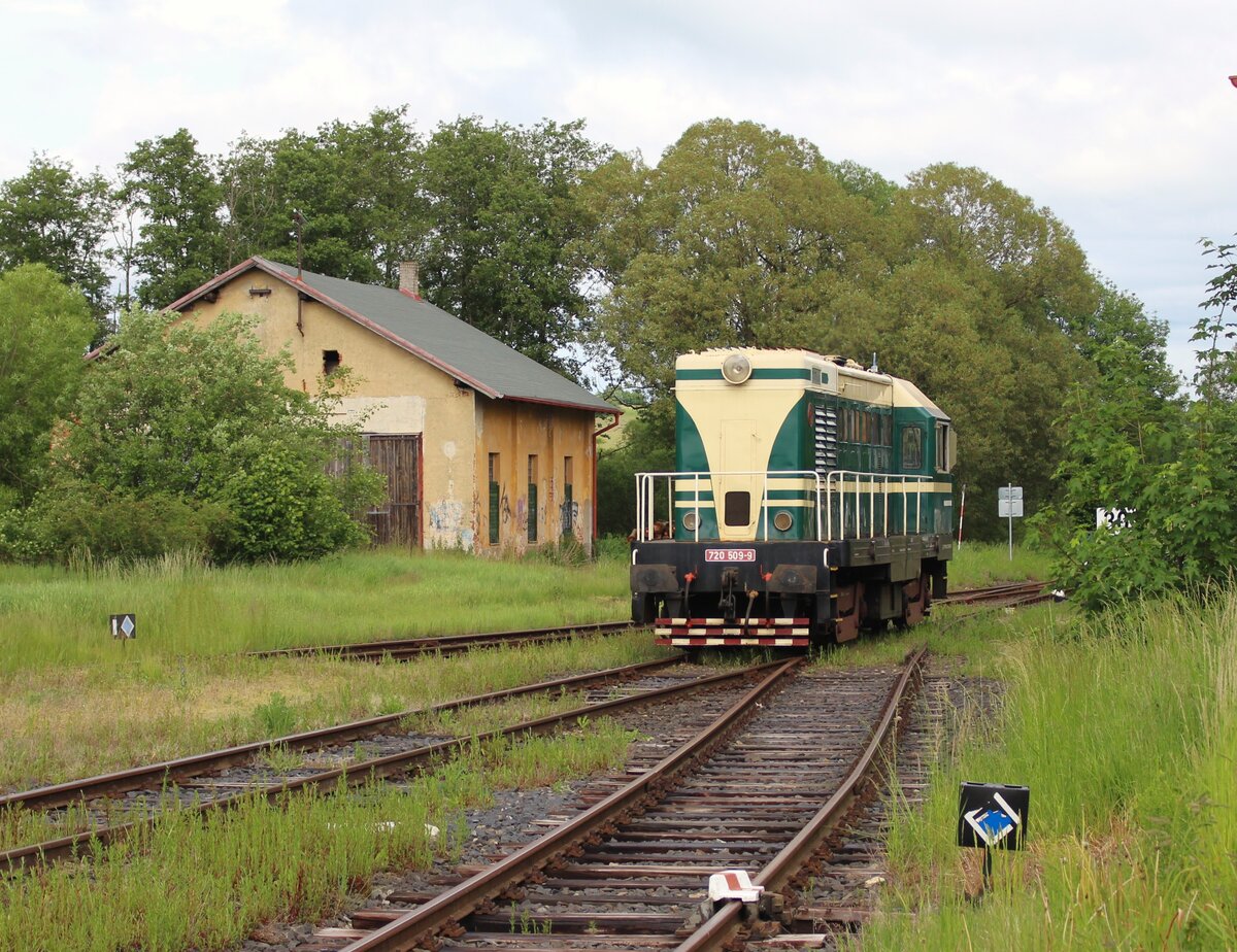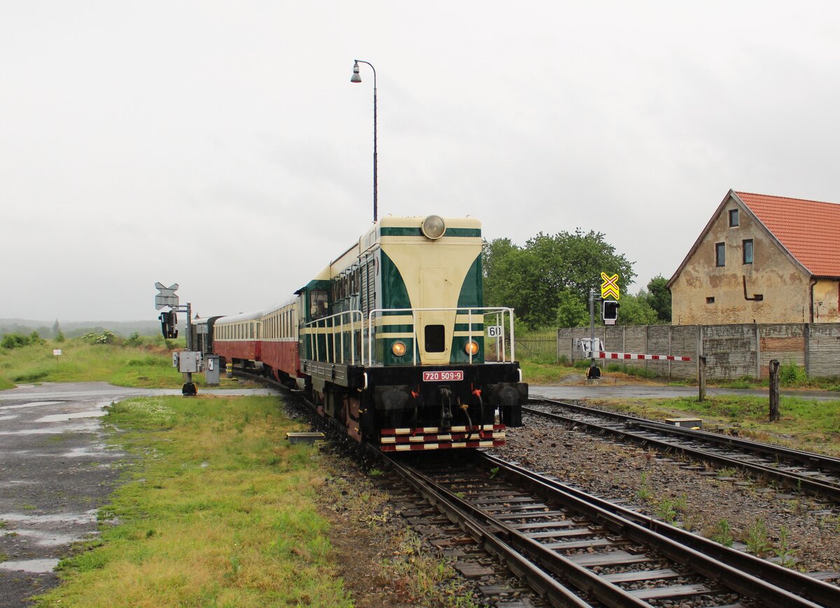 720 509-9 fuhr am 07.06.25 von Rakovnik nach Bochov. Der Grund für meinen Besuch dort war. Auf dem Streckenabschnitt zwischen Protivec und Bochov findet kein planmäßiger Personenverkehr mehr statt. 720 509-9 als Os 93142 ist hier in Čichalov zu sehen. Alexander Hertel