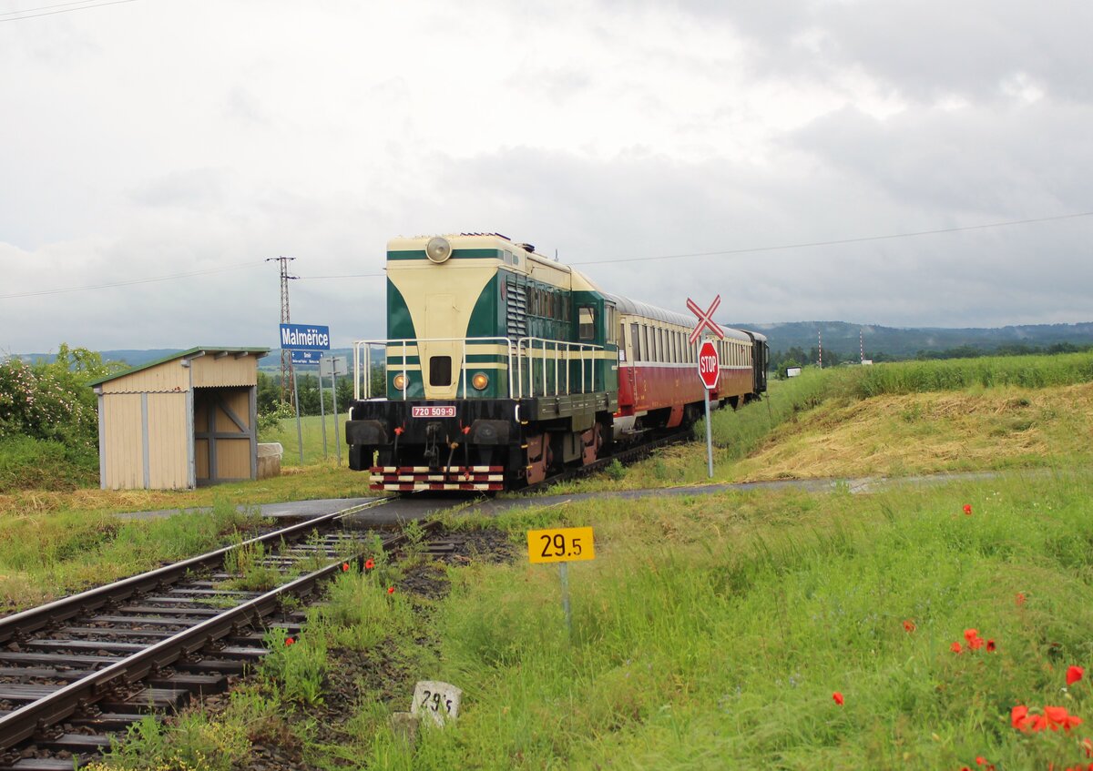 720 509-9 fuhr am 07.06.25 von Rakovnik nach Bochov. Der Grund für meinen Besuch dort war. Auf dem Streckenabschnitt zwischen Protivec und Bochov findet kein planmäßiger Personenverkehr mehr statt. 720 509-9 als Os 93140 ist hier in Malměřice zu sehen. Alexander Hertel