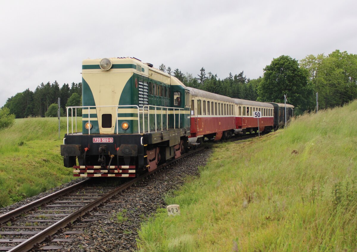 720 509-9 fuhr am 07.06.25 von Rakovnik nach Bochov. Der Grund für meinen Besuch dort war. Auf dem Streckenabschnitt zwischen Protivec und Bochov findet kein planmäßiger Personenverkehr mehr statt. 720 509-9 als Os 93140 ist hier bei Bochov zu sehen. Alexander Hertel