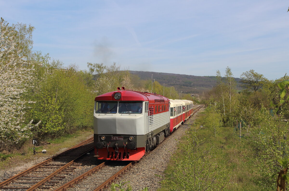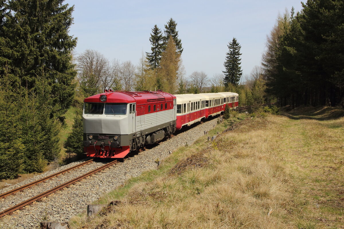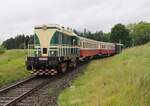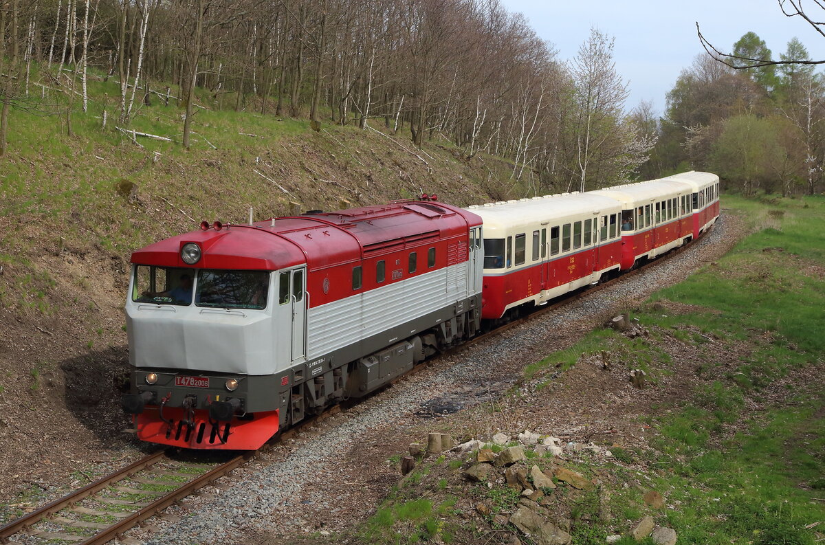 ie T478 2006 (751 236) mit einem Schlafwagen auf dem Weg von Benesov nach Chemnitz Hilbersdorf. Dort fand an dem Wochenende das Heizhausfest statt und die Bardotte war dort eine der Gastloks. Aufgenommen am Haltepunkt Kimov zastavka auf der Strecke zwischen Chomutov und Vejpert am 21.08.2025 Andreas Schreiber