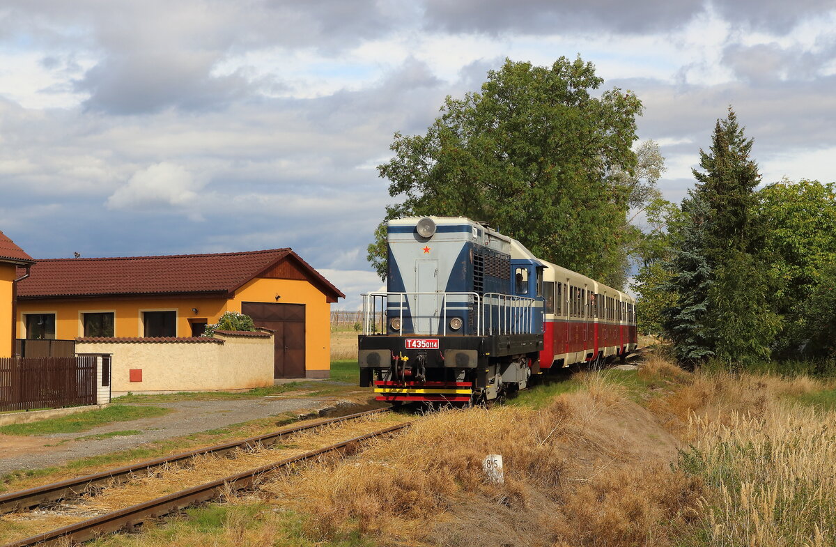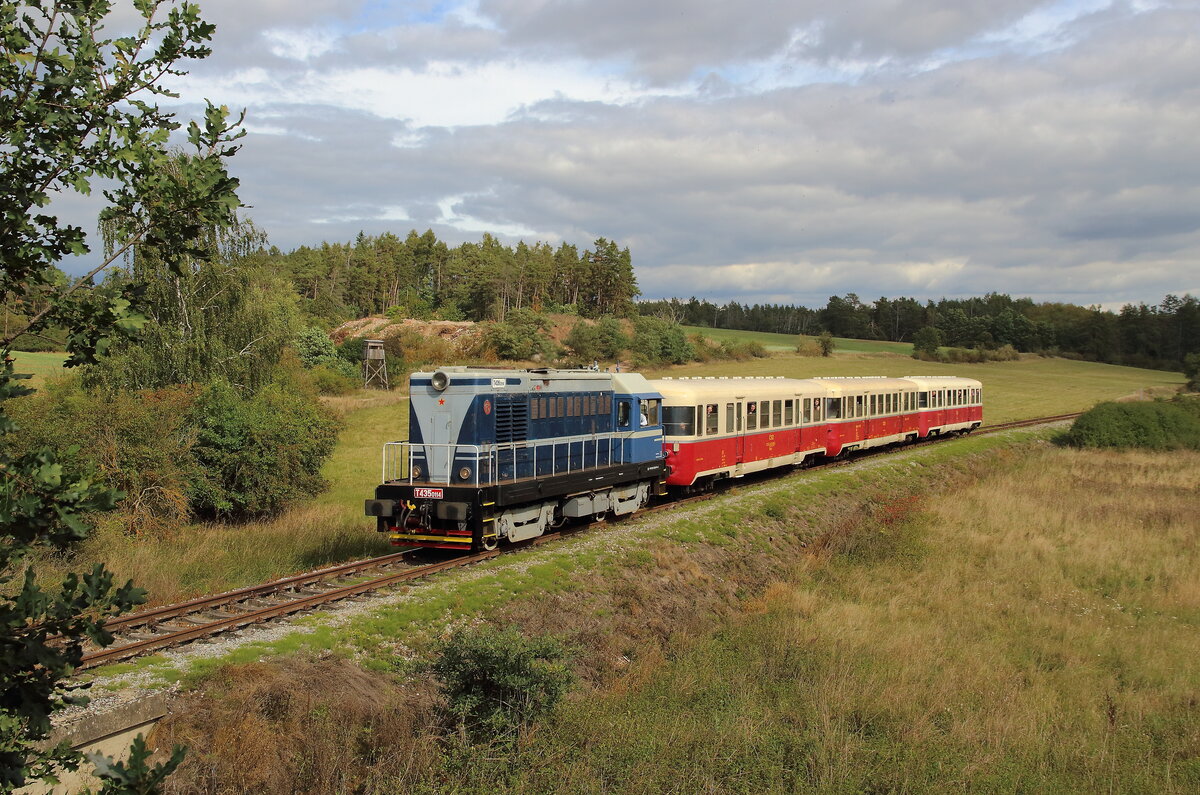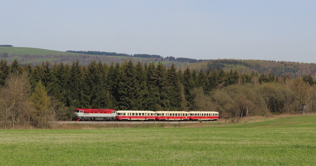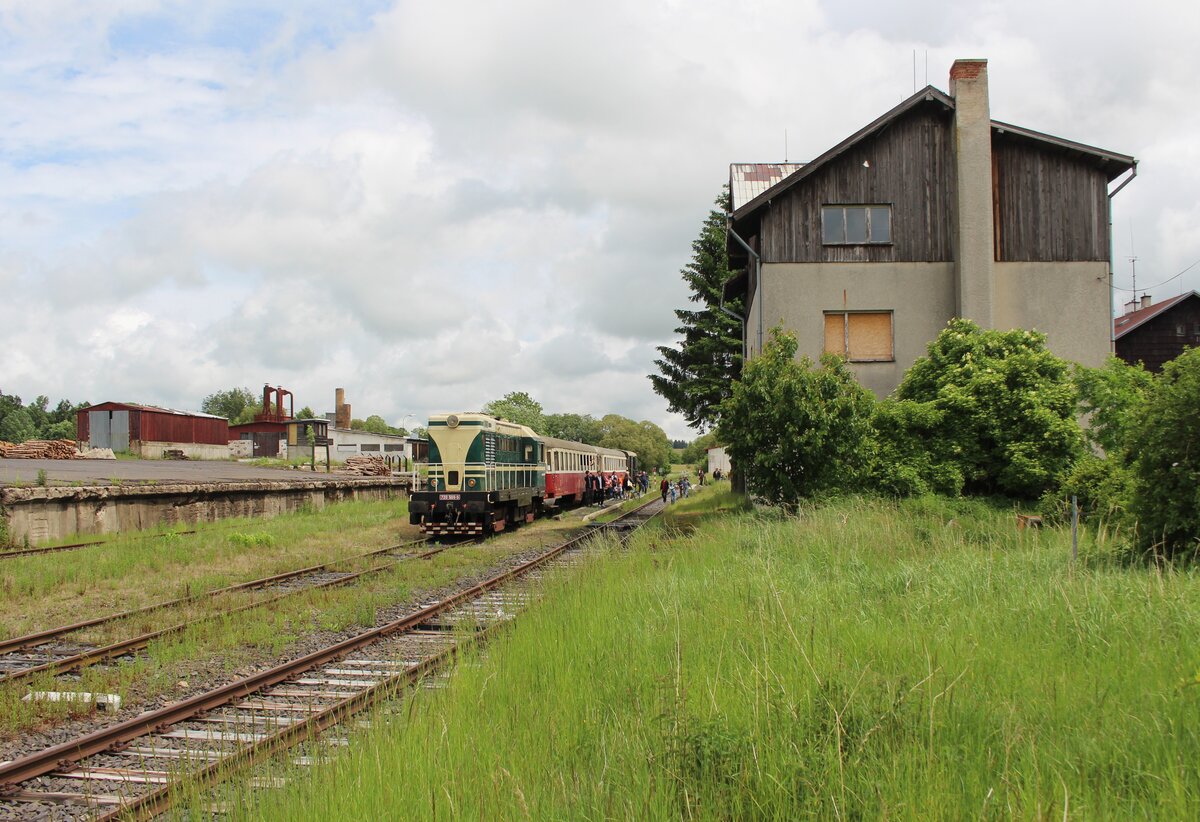 ie T478 2006 (751 236) mit einem Schlafwagen auf dem Weg von Benesov nach Chemnitz Hilbersdorf. Dort fand an dem Wochenende das Heizhausfest statt und die Bardotte war dort eine der Gastloks. Aufgenommen am Haltepunkt Kimov zastavka auf der Strecke zwischen Chomutov und Vejpert am 21.08.2025 Andreas Schreiber