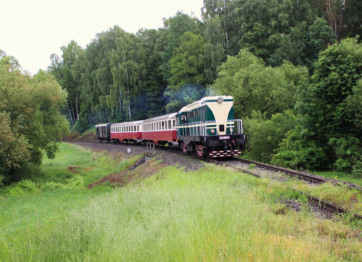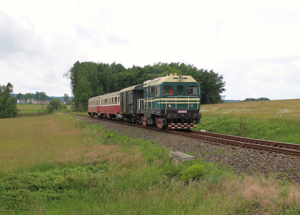 720 509-9 fuhr am 07.06.25 von Rakovnik nach Bochov. Der Grund für meinen Besuch dort war. Auf dem Streckenabschnitt zwischen Protivec und Bochov findet kein planmäßiger Personenverkehr mehr statt. 720 509-9 als Os 93140 ist hier bei Chyše zu sehen. Alexander Hertel