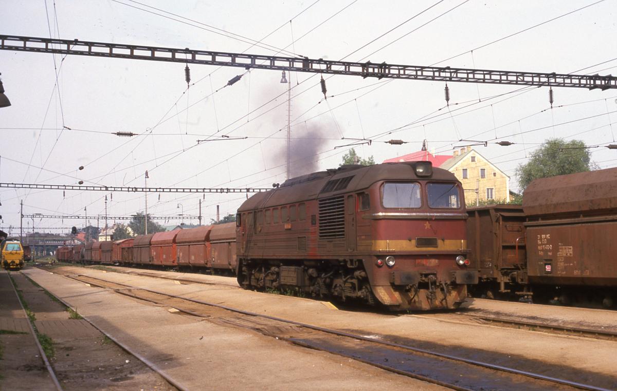 Während rechts T 6791159 am 19.6.1988 auf Einfahrt in das Depot Sokolov wartet, rollt Schwesterlok T 6791529 mit gut besetztem Führerstand mit einem Kohlezug aus