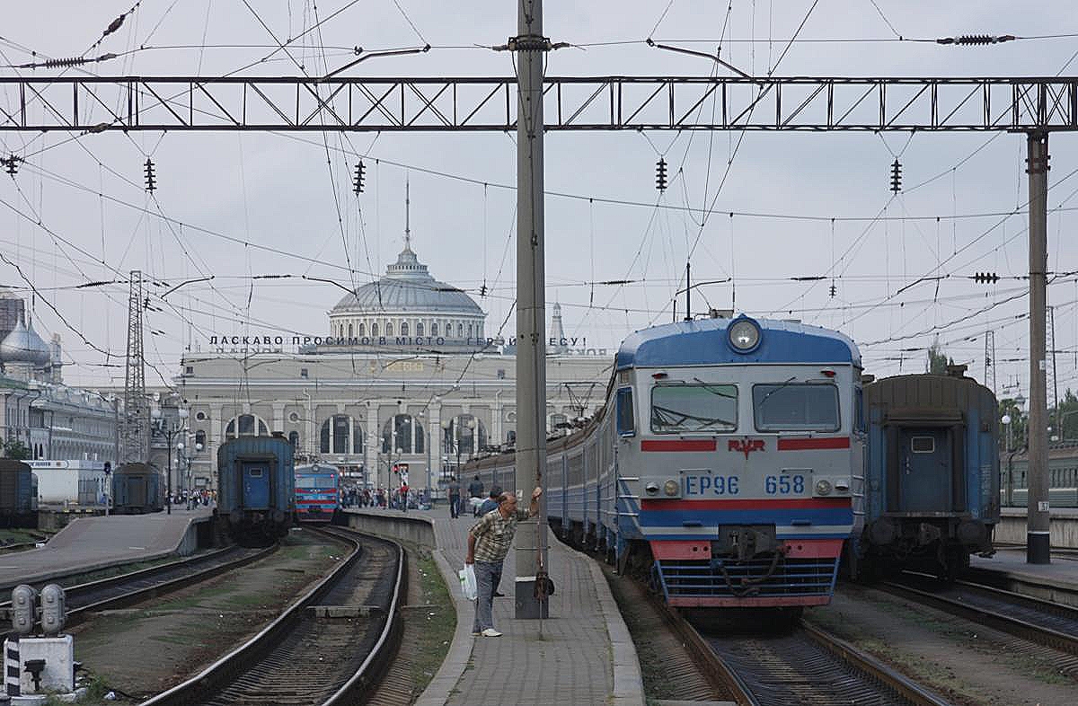 Tagsüber bestimmen vielfach Nahverkehrstriebwagen und nicht Fernzüge das Bild im Hauptbahnhof von Odessa. Da die langen Bahnsteige nicht überdacht sind, geben sie bei den meisten Einstellungen den Blick frei bis hin zum schönen Bahnhofsgebäude wie hier am 4.9.2009.