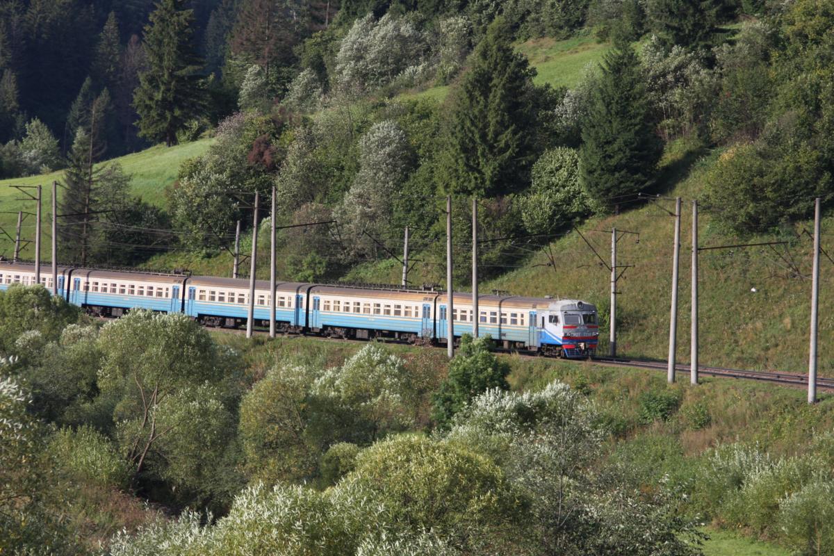 Irgendwo in den Karpaten kam mir am 1.6.2009 auf dem Weg von Lviv nach Tschop dieser ER 1029 Elektrotriebwagen entgegen. Die Strecke verlief gerade in einem weiten Bogen und das Gegengleis war ein Stück von unserem Zug entfernt. Unseren Zug sieht man übrigens schon weit voraus. Er fährt gerade hinten durch das Bild. Da ich in einem der hinteren Wagen saß, war diese Perspektive möglich. Der Zug führte übrigens 18 Wagen!