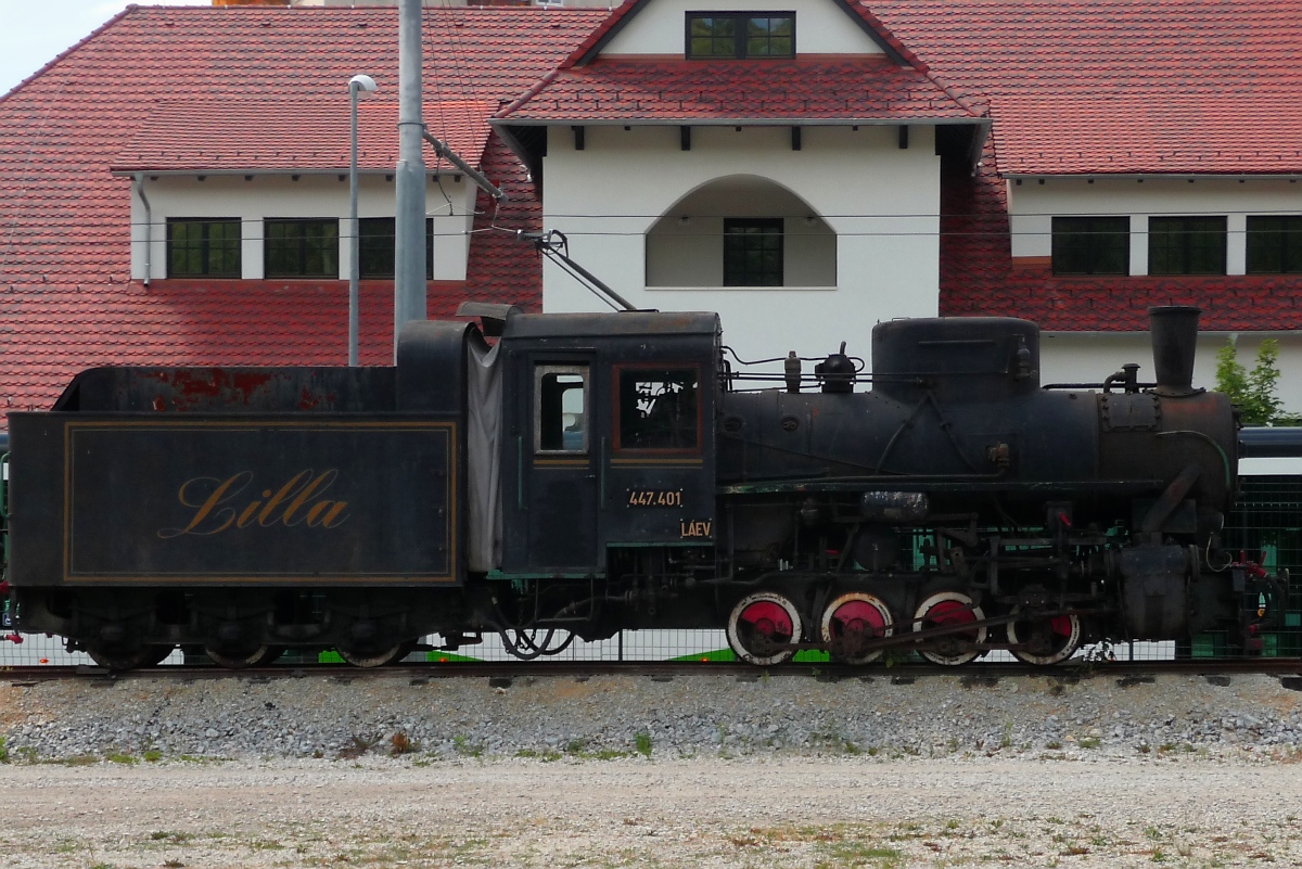 Ausrangiert und abgestellt steht die Lok "Lilla", 447 401 der LAEV, in Miskolc-Majlath, 10.7.16