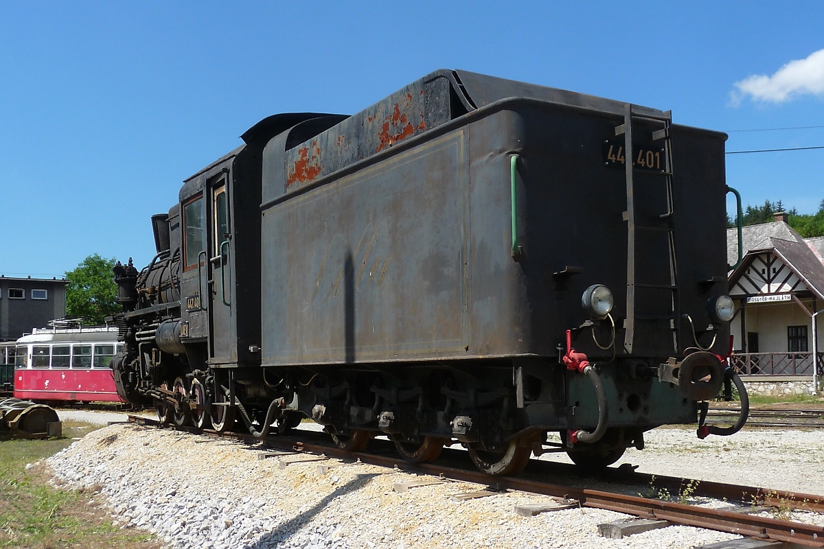 Lillafüredi Állami Erdei Vasút (LÁEV). Vor dem Depot in Majláth stehen ex Wiener Strassenbahn Wagen 189, Dampflok 447.401 und daneben an der Endhaltestelle Majláth Skoda Tram 619. (13.06.2018) Herbert Graf
