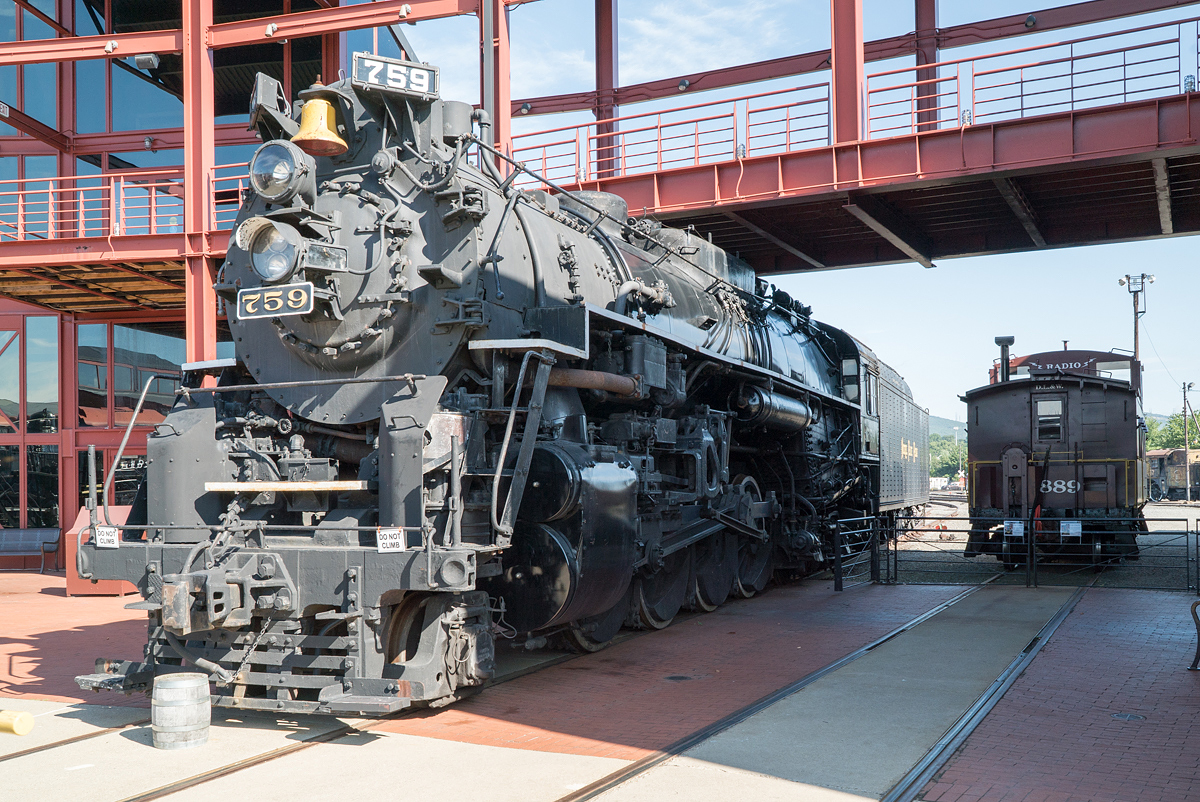 Nickle Plate Road #759 Class 2-8-4 am 06.08.2022 in der Steamtown National Historic Site in Scranton, PA. Rechts daneben ein Güterzugbegleitwagen (Caboose). Ingo Konrad Müller