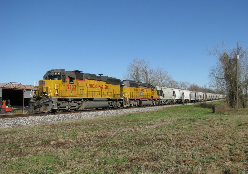 Die Union Pacific Loks 2733 und 3317 mit einem Ganzzug am 6.2.2008 in Sealy (bei Houston, Texas).