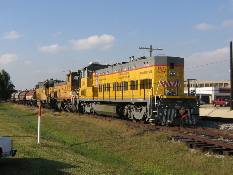 Die Union Pacific Loks 2733 und 3317 mit einem Ganzzug am 6.2.2008 in  Sealy (bei Houston, Texas).