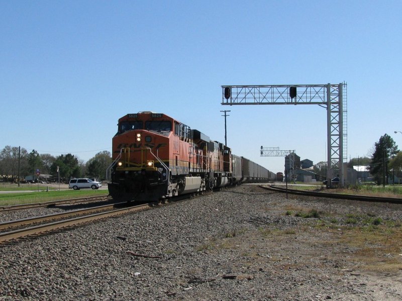 Die BSNF Loks 9762 und 6064 (dieses Lok trägt bereits das neue BNSF Logo) mit einem Güterzug am 21.11.2007 in Sealy (bei Houston, Texas).