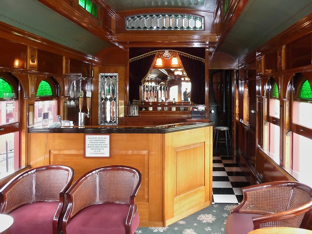 Gemütlich bestuhlt und mit schönen Deckenlampen ausgestattet ist der Barwagen (Strasburg, 02.06.09).