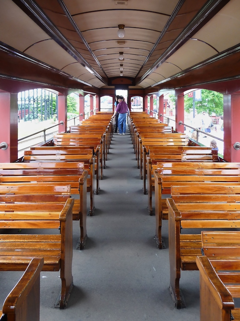 Auch der nächste Wagen hat Polstersitzen, jedoch einfachere Deckenleuchten. Die Rückenlehnen können auf beide Seiten der Sitzbank geklappt werden, so kann man immer in Fahrtrichtung sitzen. (Strasburg, 02.06.09)